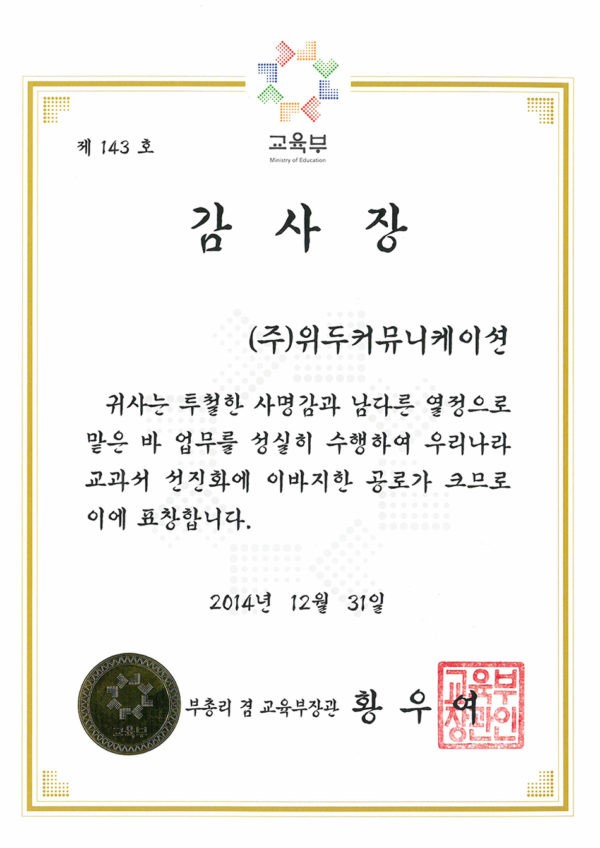 감사장 제 143호 페이지 정보 작성자 WeDu 댓글 0건 조회 6,251회 작성일 19-05-30 19:33 본문 2014-12-31 감사장 제 143호 교과서 선진화 부총리 겸 교육부장관 황우여 List Previous산업통상자원부 표창장 19.05.30 Next한국여성벤처협회 표창장 19.05.30