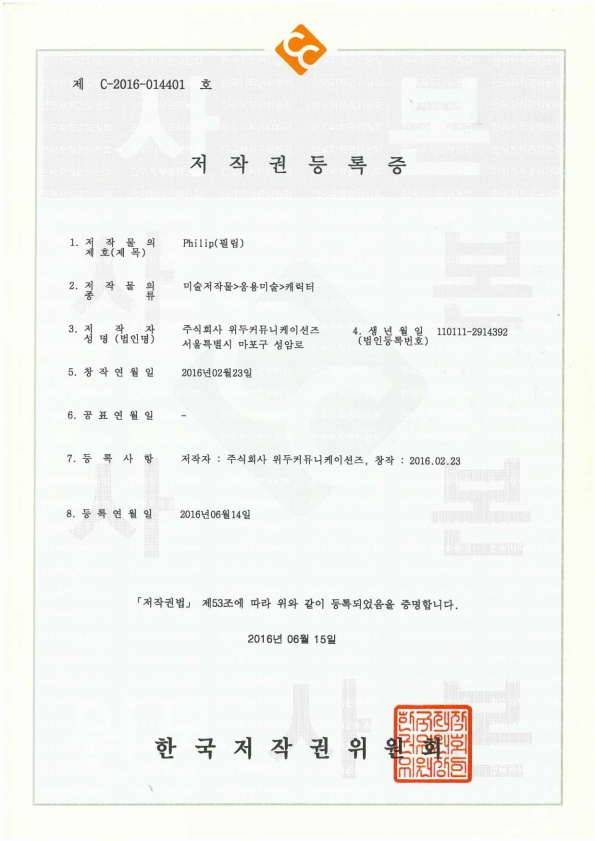 [한국/저작권] 필립 페이지 정보 작성자 WeDu 댓글 0건 조회 6,220회 작성일 19-05-30 19:09 본문 2016-06-14 저작권 C-2016-014401 필립 / 미술저작물>응용미술>캐릭터 List Previous[한국/저작권] 월터 19.05.30 Next[한국/저작권] 아리스 19.05.30