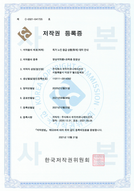 [한국/저작권] 독거 노인 응급 상황(화재) 대피 안내 페이지 정보 작성자 WeDu 댓글 0건 조회 6,684회 작성일 21-12-31 12:41 본문 2021-10-21 저작권 C-2021-041725 영상저작물>교육용 동영상 List Previous[한국/저작권] 장보기 인지훈련 게임 21.12.31 Next[한국/저작권] OLL KIDS/MATH 21.12.31